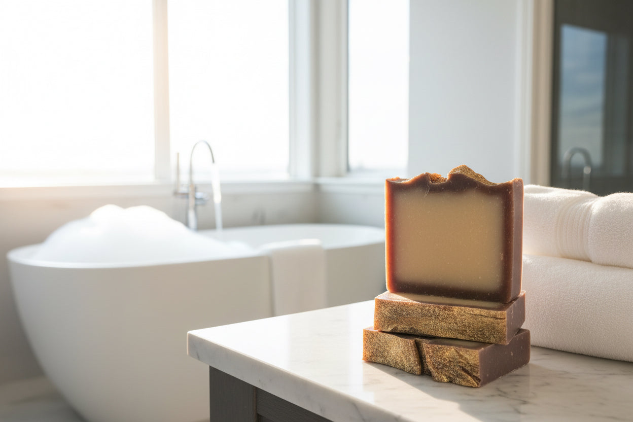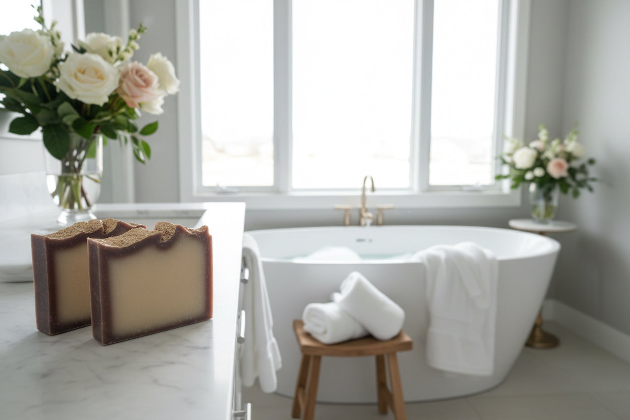 Soap Ingredients: Saponified 100% Extra Virgin Olive Oil, Coconut Oil, Castor Oil, Avocado Oil, Shea Butter, and an Essential Oil Blend of pistachio, almond, salted caramel, sandalwood, Jasmine